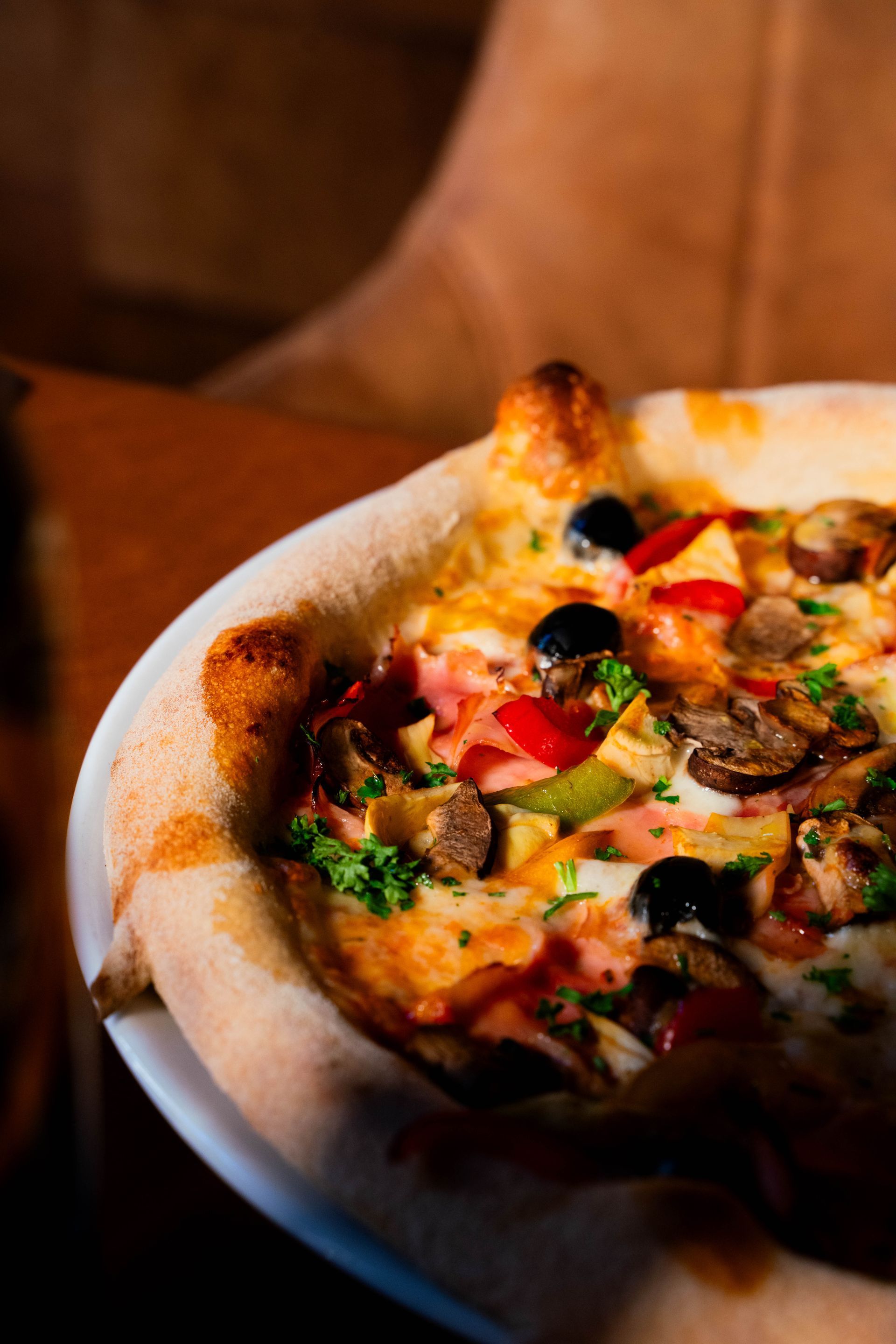 T & m, mushroom, paprika, ham, artichoke, olives